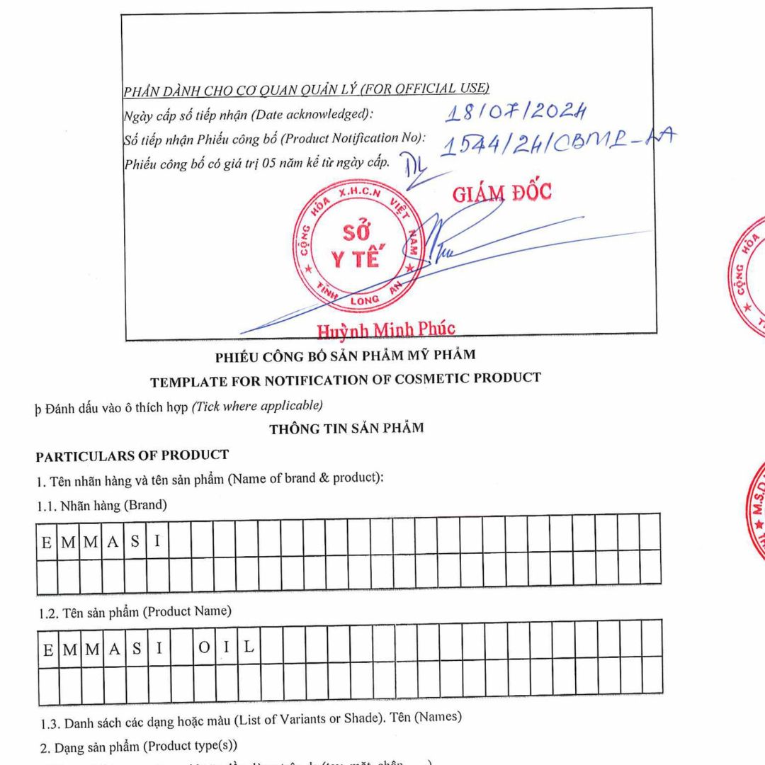 Giấy chứng nhận công bố sản phẩm Dầu rạn da Emmasi oil, phiếu công bố được sở y tế cấp phép đủ điều kiện lưu hành toàn quốc.